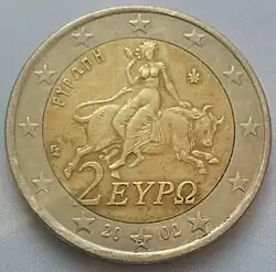 На монете Греции изображено похищение Европы Зевсом, в виде быка, изображенный на Спартанской мозаике 3 века до н. э. От этой мифологической Европы получил имя континент: «Европа». Стоимость евро на греческом алфавите, 2 EYPΩ снизу. Слово «Europa» (ΕΥΡΩΠΗ) на греческом языке слева сверху. Разработал эскиз монеты художник Георгиос Стаматопулос (Georgios Stamatopoulos). |