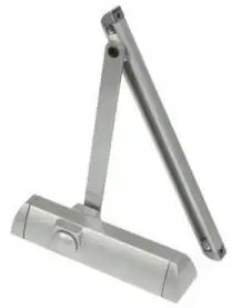 - С рычажной (коленной, шарнирной) тягой (англ. scissor arm). В конструкции таких доводчиков вращающий момент передаётся с помощью складного рычага. Правильно установленная шарнирная тяга очень надёжна и долговечна, но имеет серьёзный недостаток – низкую защищённость от вандализма. Торчащие перпендикулярно коробке колена таких тяг выглядят не эстетично и могут вызывать желание за них схватиться или даже повиснуть.