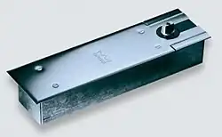 - Демпфер открывания или ветровой тормоз (англ. Back Check, BC). Представляет собой дополнительный гидравлический контур с собственной регулировкой, который ограничивает максимальную скорость открывания двери. Эта функция не даст двери распахнуться с опасно высокой скоростью при резком порыве ветра или от резких действий человека, не позволяя двери ударить по стене или по оказавшемуся в «зоне поражения» человеку. Данная функция настоятельно рекомендуется для применения на всех внешних дверях и обязательна при наличии сильных ветров или сквозняков.