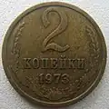 18 мм | 2 г | Герб СССР и указание страны | Номинал и год чеканки с двумя колосьями | латунь | 1961—1991 |