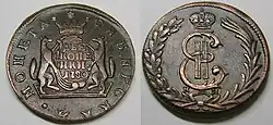 | 28 мм | 13,1 г | Вензель Екатерины II, указание монетного двора и растительный орнамент | Два соболя, поддерживающие картуш с номиналом и годом чеканки, надпись «Сибирская монета» | колыванская медь | 1764—1780 | Сибирская губерния | ||