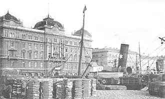 Из-за внезапной индустриализации города Риека в конце XIX века, в том числе строительство двух железнодорожных коммуникаций внешней и внутренней, и, как следствие того, увеличение импортно-экспортных операций, дали подъем международному портовому и железнодорожному транспорту, обрабатывающей промышленности, торговле и экспедиторству, финансовым и банковским операциям. Началась адаптация и надстройка существующих или строящихся новых офисных зданий для администрации и администрации. Река тогда была в подчинении у Венгрии. Административные, некоторые бизнес-дворцы представляющие королевскую государственную власть Будапешта были созданы или адаптированы для размещения государственных служб, в том числе железнодорожных, портовых, таможенных, налоговых офисов). В то же время некоторые бизнес-здания, например здание местной итальянской городской администрации, были созданы на общественные деньги или капиталом экономически могущественных обществ (судоходных компаний, банкиров, промышленников, купцов). Это была Риека конца XIX века.[1]