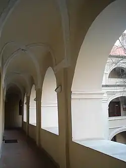 Над воротами с улицы в прошлом находилась таблица с изображением папской тиары (по другим сведениям — рельеф с инициалами папы и изображением шапки кардинала[3]). Широкие ворота ведут в прямоугольный репрезентационный двор, образованный трёхэтажными жилыми корпусами с аркадами вместо коридоров (позднее часть аркад была замурована; с северной стороны здание было построено позднее) — один из красивейших дворов Вильнюса[4]. Открытые аркады галерей на всех этажах и пилястры выполнены в стиле позднего итальянского Ренессанса. Стены над аркадами были расписаны портретами римских пап (фрески не сохранились). По другим сведениям, фрески с портретами 47 пап римских украшали фасад, выходящий на улицу, и были закрашены в середине XIX века.