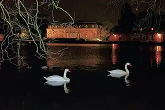 На южном берегу искусственного круглого пруда выстроен полукруг представительских сооружений — главное здание дворца (корделож, фр. Corps de Logis) и два боковых флигеля. Во дворце располагались жилые помещения курфюрста и его супруги; к нему примыкали небольшие «личные парки» высочайших особ. Боковые флигели — «кавалерские дома» — предназначались для свиты.