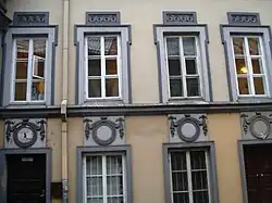 Овальная башенка на углу играла роль контрфорса, а во время войн использовалась для обороны[1]. Башенка и арка въезда отделаны рустом.