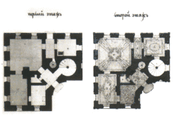 Планировка и компоновка объёмов здания необычны. Дворец — почти кубическое двухэтажное здание с балюстрадой по краю крыши. В плане здание форму квадрата с одним из углов, срезанных по плавной дуге; именно эта «дуга» — главный фасад дворца, благодаря чему здание видно сразу с трёх сторон и придаёт дворцу более массивный и значительный вид[L 3].