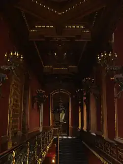 В декоре интерьеров преобладает стиль необарокко. Стены украшены резными деревянными панелями и рельефами.