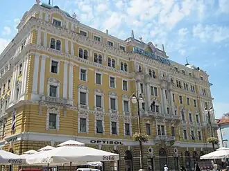 Из-за внезапной индустриализации города Риека в конце XIX века, в том числе строительство двух железнодорожных коммуникаций внешней и внутренней, и, как следствие того, увеличение импортно-экспортных операций, дали подъем международному портовому и железнодорожному транспорту, обрабатывающей промышленности, торговле и экспедиторству, финансовым и банковским операциям. Началась адаптация и надстройка существующих или строящихся новых офисных зданий для администрации и администрации. Река тогда была в подчинении у Венгрии. Административные, некоторые бизнес-дворцы представляющие королевскую государственную власть Будапешта были созданы или адаптированы для размещения государственных служб, в том числе железнодорожных, портовых, таможенных, налоговых офисов). В то же время некоторые бизнес-здания, например здание местной итальянской городской администрации, были созданы на общественные деньги или капиталом экономически могущественных обществ (судоходных компаний, банкиров, промышленников, купцов). Это была Риека конца XIX века.[1]