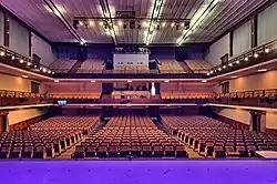 Два крыла дома культуры соединяются мостиками-переходами на уровне второго и третьего этажей[3]. В правом крыле здания расположена театрально-зрелищная часть с объёмным зрительным залом. Высотой 13 метров с двумя ярусами балконов он вмещает до 1200 зрителей. Кассовый вестибюль вынесен вперёд и расположен в отдельном небольшом объёме со скруглёнными углами. На втором этаже находится фойе для отдыха перед спектаклем и малый зал, отделяющий театральную зону от клубной. Клубную секцию площадью 1200 м² по состоянию на 2019 год занимают Институт современного искусства и библиотека, ранее здесь размещались кружки и секции[10][11][1][12].