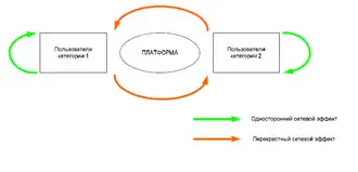 В двусторонней сети пользователи одной категории изменяют отношение к пользованию сетью в зависимости от числа пользователей другой категории. Это явление называется перекрёстным сетевым эффектом. Каждый член группы пользователей также изменяет отношение к её использованию в зависимости от числа пользователей той же категории. Это явление называется односторонним сетевым эффектом. Сетевой эффект является положительным, если возрастание числа пользователей повышает ценность пользования сетью, и отрицательным в обратном случае. Перекрёстные сетевые эффекты в двусторонней сети обычно положительные, но могут быть и отрицательными. Односторонние сетевые эффекты могут быть как положительными, так и отрицательными.