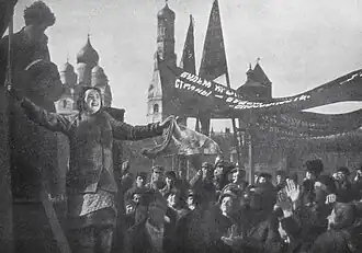 Но внезапно улицу заполняет праздничная демонстрация комсомольцев. Чижок выступает с трибуны на фоне Кремля[8]. Ей аплодирует вся площадь[9].