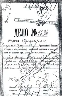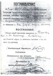1919, 3 ноября. - Приговорён президиумом Тульской ГубЧК по делу 1636 к заключению «в концентрационный лагерь до окончания гражданской войны». Заключённый концлагеря принудительных работ при Тульском Совете.