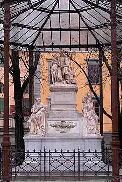 Надпись на памятнике: «Perchè il popolo di San Niccolò avesse ognora dinanzi memoria viva del commendatore Niccola Demidoff indefesso benefattore munifico il figlio principe Anatolio al Comune di Firenze questo monumento dono MDCCCLXX»