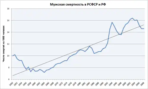 К концу 1990-х годов темпы естественной убыли населения превысили 900 тыс.[39]. По данным переписи населения 2002 года, численность населения России с 1989 по 2002 год сократилась на 1,8 млн (~на 1,3 %)[41]. Особенно велика была смертность среди российских мужчин, средняя продолжительность жизни которых равнялась 61,4 года[42]. Средняя продолжительность жизни женщин за тот же период составила 73,9 года[42].