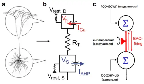| Кальциевый спайк, который активируется потенциалом действия обратного распространения (BAC firing)[40] |