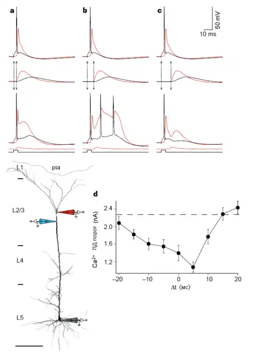 - ↑ Stuart Greg J., Häusser Michael. Dendritic coincidence detection of EPSPs and action potentials (англ.) // Nature Neuroscience : journal. — 2001. — Vol. 4, no. 1. — P. 63—71. — ISSN 10976256. — doi:10.1038/82910.
