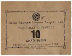 Расчётные квитанции (боны) номиналом 1, 3, 5 и 10 рублей выпущены Главным Управлением Северных Лагерей НКВД только в 1936 году. Появились в обращении среди коллекционеров в конце 80-х годов, после рассекречивания значительной части архивов НКВД в период Перестройки. Подобными платёжными средствами лагерное руководство выдавало зарплаты и премии заключённым за перевыполнение плана. Об употреблении говорит оттиск печати, являвшийся необходимым условием для приёма суррогатов в лагерном ларьке.