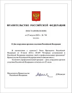 - Постановление Правительства Российской Федерации от 27 августа 2013 г. № 741 «О дне сотрудника органов следствия Российской Федерации»;