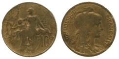 В 1870 году Третьей республикой начат выпуск новых 10-сантимовых монет. Диаметр и вес монет, установленные в период Второй империи, остались неизменными. Новый тип монет («Церера») разработал Эжен Удине. В 1898 году тип монет изменился. Новый тип монет («Дюпюи») разработал Жан-Батист-Даниэль Дюпюи[3].