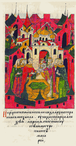 Крестил её, по одним сообщениям, Афанасий[7]. Однако в Лицевом летописном своде записано: «И в тот же Пост, в четвертое воскресенье, крестил её в Чудовом монастыре архистратига Михаила, а принял её от купели Макарий, митрополит всея Руси, а священнодействовал Андрей, протопоп Благовещенский».