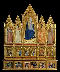 - 4. «Мадонна с младенцем, святыми и евангельскими сюжетами» (ок. 1355г., Рим, Галерея Корсини), икона, размером 55х87 см, на которой художник изобразил, кроме Мадонны, «Благовещение», «Рождество», «Распятие», «Оплакивание Христа» и также 6 святых: Св. Николая, Стефана (или Лаврентия), Якова, Евстафия, Екатерину Александрийскую и Маргариту.