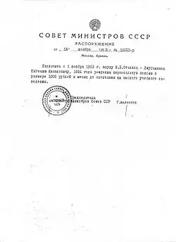 После смерти деда распоряжением Совета Министров СССР от 14 ноября 1953 год № 15022-р, подписанным председателем Совета Министров СССР Г. М. Маленковым, Евгению Джугашвили как внуку Сталина была назначена персональная пенсия в размере 1000 рублей в месяц до окончания высшего учебного заведения.