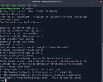 «Дзен Пайтона» задуман как формулировка философии дизайна Python и включена в официальную литературу по Python. В интерпретаторе Python присутствует как пасхальное яйцо: если ввести в команду — import this[4], то в окне отобразится его текст.
