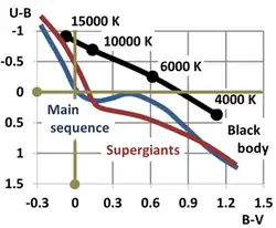 На диаграмме звёзды выстраиваются в виде некоторых линий. Если бы звёзды являлись идеальными абсолютно чёрными телами, то на диаграммах располагались бы на прямых линиях. Отличия от прямых линий возникают вследствие наличия линий поглощения и излучения в спектре. Отличия могут быть более или менее выраженными в зависимости от используемых при наблюдении фильтров: при использовании узкополосных фильтров с центральной длиной волны, лежащей вне области линий, участок спектра будет выглядеть аналогично чернотельному; но даже если фильтр центрирован на содержащую линии область, при достаточной ширине полосы пропускания спектр может быть близким к спектру излучения абсолютно чёрного тела.