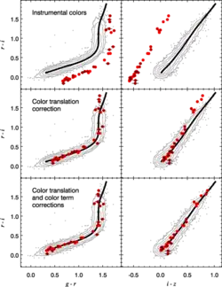 Диаграмма цвет — цвет для звёзд может применяться для калибровки или для проверки значений цветов и звёздных величин по данным оптических или инфракрасных наблюдений. Подобные алгоритмы используют методы исследований распределения цвета звёзд в Галактике и опираются на утверждение о независимости наблюдаемого цвета звёзд от расстояния до них. Метод регрессии положения звёзд (англ. Stellar locus regression, SLR)[3] разработан для исключения необходимости наблюдений стандартных звёзд в рамках фотометрических калибровок, за исключением весьма редких (раз в год или реже) измерений цвета. Метод SLR применяется в ряде научных проектов. Обзор NEWFIRM (NOAO Deep Wide-Field Survey) использовал данный метод для получения более точных цветов по сравнению с традиционными методами калибровки; при наблюдениях на Южном Полярном телескопе SLR применяется при измерении красного смещения скоплений галактик.[4] Ряд других обзоров использует диаграммы цвет — цвет в основном в качестве инструмента для проверки калибровок, например, обзор SDSS.[5]