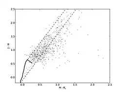 На диаграмму цвет — цвет можно нанести теоретическую кривую для звёзд главной последовательности, как показано на примере чёрной линией. Поскольку имеются сведения о рассеянии межзвёздной пылью, то на диаграмму можно нанести полосы, в которых располагаются звёзды, излучение которых испытывает межзвёздное покраснение. Данные полосы изображены пунктирными линиями. Обычно на диаграммах по горизонтальной оси отложен цвет (H-K), по вертикальной оси отложен цвет (J-H). Звезды, располагающиеся правее от главной последовательности и полос покраснения, существенно ярче в полосе K, чем звёзды главной последовательности. В эту же категорию попадают звёзды главной последовательности, излучение которых испытало сильное покраснение. Среди полос J, H и K полоса K является наиболее длинноволновой, поэтому аномально яркие в полосе K объекты проявляют наличие инфракрасного избытка. Вероятно, подобные объекты являются протозвёздами, при этом инфракрасный избыток может быть связан с наличием отражательной туманности.[11] В подобных случаях диаграммы можно использовать для изучения звездообразования.[12]