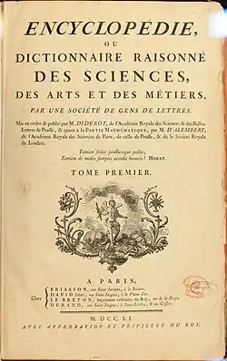 Дидро обладал широким и всесторонним образованием, солидными знаниями в области философии и естествознания, социальных наук, литературы, живописи, театра и т. п. Это позволило ему стать организатором и главным редактором «Энциклопедии», первый том которой вышел в 1751 году, и которая с перерывами издавалась в течение двадцати девяти лет. Дидро был автором большинства статей по точным наукам, экономике, механике, философии, политике, религии. Под его редакцией были созданы первые 28 из 35 томов «Энциклопедии» — 17 томов текста (6 тысяч статей) и 11 томов «гравюр» (иллюстраций к тексту), опубликованные между 1751 и 1766 годами.