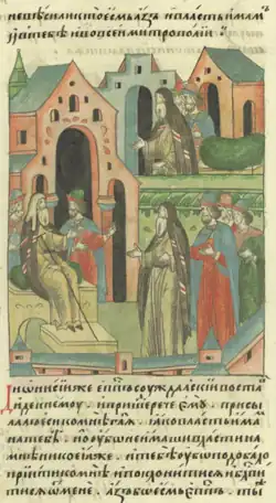 Святитель Дионисий перед князем Дмитрием Донским (миниатюра Лицевого летописного свода)