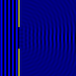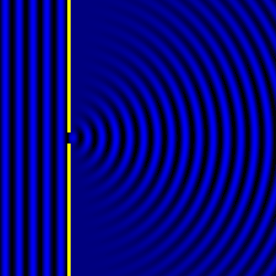 Распространение волны через щель шириною в длину волны. Распространение волны через щель, превосходящую шириною длину волны в шесть раз.