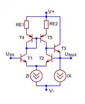 В обоих случаях каскад превращается в генератор разностного тока , который направляется в высокоомную внешнюю цепь, при этом напряжения покоя на коллекторах или стоках дифференциальной пары не определены[70][68]. Чтобы избежать «залипания» каскада в одном из двух крайних положений, его рабочая точка устанавливается принудительно — петлёй глобальной обратной связи, цепью автоматического регулирования тока эмиттеров дифференциальной пары[71] или тока активной нагрузки[72].