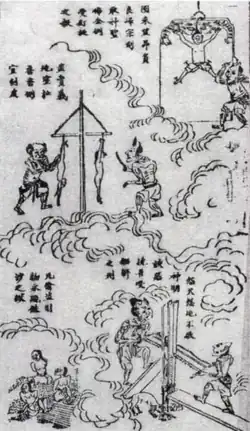 - «Три пытки», или Сань-ту (三塗): огнём (火塗 — «хо-ту»), ножами (刀塗 — «дао-ту»), кровью (血塗 — «сюэ-ту»).