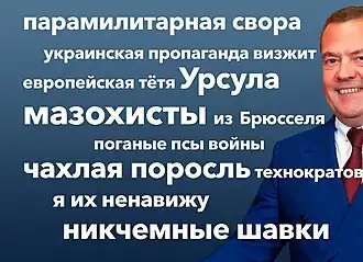 В российских социальных сетях особенно активно цитируют Медведева, который, среди прочего, написал, что «священная цель» России в войне против Украины — битва с Сатаной, под которым подразумевается Запад. В поздравлении россиян с Днём народного единства политик призывал «остановить верховного властелина ада». В соответствующей стилистике выдержан и остальной текст. Медведев также уверял, что России на Украине противостоит «кучка безумных нацистов-наркоманов», «большая стая лающих собак из западной псарни» и «разномастная свора хрюкающих подсвинков и недалёких обывателей из распавшейся западной империи со стекающей по подбородку от вырождения слюной»[5].