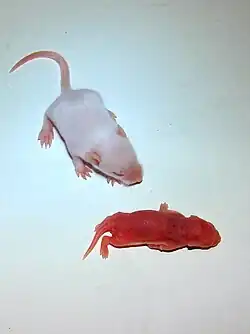 Лабораторные мышата, снизу — новорождённый детёныш, сверху — более взрослый, покрытый пухом