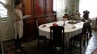 В центре столовой располагается большой обеденный стол. За каждым из членов семьи были закреплены собственные столовые принадлежности, которые представлены в экспозиции. Интерьер дополняют старинные часы с маятником, ломберный столик, буфет, книжный шкаф, где книги по химии соседствуют с работами по краеведению, истории и художественной литературой (все находящиеся в нём книги имеют дарственные надписи Александру Арбузову от авторов[87]), а также комнатные цветы, за которыми ухаживала Екатерина Арбузова[23]. В столовой находится печка с плитой. Во время Великой Отечественной войны именно в этой комнате проживала семья академика[87].