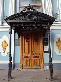 Со стороны северного фасада расположен пристроенный объём с лестничной клеткой и чёрным входом, завершённый треугольным фронтоном. Основная плоскость имеет пять окон[5].