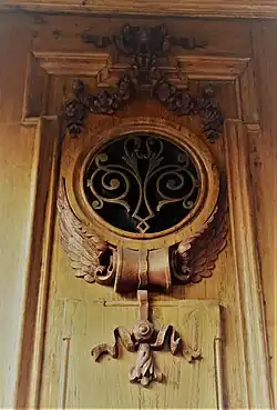 Интерьер выполнен из дерева. Горизонтальный зубчатый пояс делит плоскости стен по вертикали. В нижней части расположен ряд квадратных филенок. Верх декорирован сдвоенными наборными пилястрами с резными накладными элементами. Поперечные стены и плоскости над дверьми оформлены прямоугольными панелями с вырезанными на них свитками, завитками и цветами. Потолок разделён массивными поперечными балками, на нём расположено пять резных розеток из дерева. Пол покрыт паркетом[8].