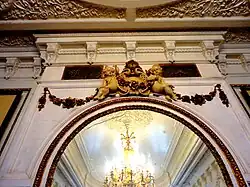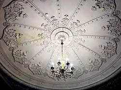 Стены окрашены в белый цвет, отдельные элементы лепнины выделены бронзой. Роскошно декорированный потолок имеет два уровня. Украшен фигурными кронштейнами, лепниной с медальонами и маскаронами по углам и орнаментом в виде бегущей волны, профилированными тягами, венчающими акантовые пояса, жгуты, жемчужник, двумя лепными розетками[7].