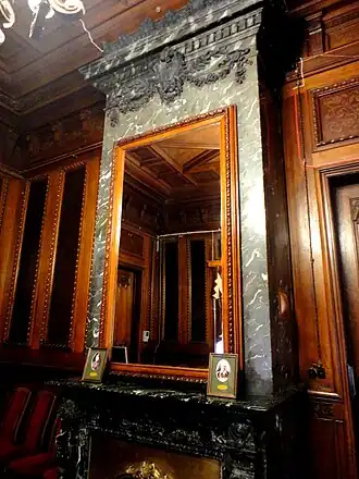 Также сохранил подлинный интерьер. В зале расположен камин, облицованный серым мрамором и декорированный картушем с ветвями и цветочными гирляндами. Стены и потолок декорированы деревом, пол выстлан дощатым паркетом. Стены разделены горизонтальным декоративным резным поясом с орнаментом в виде бегущей волны. Верхняя часть стен разбита профилированными рамками, декорированными иониками, на узкие вертикальные панели, обитые кожей с тиснёным на ней цветочным рисунком. К круглой розетке в центре крепится массивная резная люстра из дерева[8].