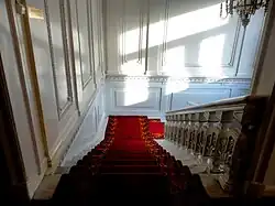 Просторный холл освещается окнами первого этажа, на который ведёт мраморная двухмаршевая лестница с массивными четырёхгранными балясинами. Стены первого этажа разделены пилястрами, опирающимися на междуэтажный пояс, включающий орнамент в виде бегущей волны. Плоскость стены между пилястрами оформлена декоративными рамками, обработанными иониками. Потолок декорирован профилированными тягами с модульонами, дентикулами, лепными орнаментальными полосами. В центре расположена розетка в виде круга, вписанного в квадрат, по сторонам которого размещены медальоны с маскаронами. Холл в уровне первого этажа связан с Аванзалом, имеющим аналогичное декоративное решение интерьера, широким балконом с балюстрадой[6].