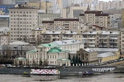 Главный фасад двухэтажного дома, украшенного трёхъярусным портиком и мезонином, обращён к пруду. На высоте первого этажа проходит рустованная аркада по столбам; на уровне второго этажа портик представляет собой ионическую колоннаду. Мезонин украшен третьим ярусом портика — тонкими коринфскими колонками. Портик завершается треугольным фронтоном. Симметрично поставленные по обеим сторонам здания ворота создают целостную композицию.
