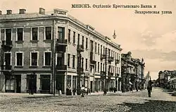 Дом построен в 1912 году, в этом же году в это здание переехало минское отделение Земельно-крестьянского банка. Часть комнат сдавалась под жилье. До 1918 года в доме располагались конторы и оптовый табачный склад-магазин общества Малина Ю. Л. и Шлапакова Н. В 1912—1913 здесь также располагается конторы сельскохозяйственных машин и устройств Раппопорта К. и Раппопорта Э., магазин общества потребителей Либаво-Роменской железной дороги. В 1913—1916 здание занимают минское отделение Крестьянского поземельного банка, управление военно-санитарных организаций, управление Всероссийского земского союза, польское военное управление. В 1914—1918 здесь располагается галантерейная лавка Глезера Янкеля Мордуховича. В 1916—1917 кабинет Главного уполномоченного Красного Креста Западного фронта, автоотдел Комиссариата народного хозяйства Западной области, управление Союза поляков-военных Западного фронта, канцелярия Материально-заготовительного отдела командования Западного фронта, кабинет начальника отдела Управления строительно-технической части, кабинет представителя главнокомандующего Западного фронта Паржецкого Р. И., управление строительно-технической части Западного фронта (кв. 2). В 1916—1919 — бакалейная лавка Грыневского В. Ф.[1]