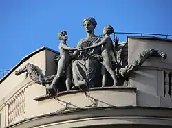 До 1952 года здание украшала скульптурная композиция Деметры с детьми, которая позже была замурована в одном из зданий Министерства внутренних дел. Значительно поврежденная скульптура была найдена в 2000-х годах. В 2004 году она была восстановлена скульпторами Александром Дранцем и Павлом Цыбулей, после чего была возвращена на историческое место[2].
