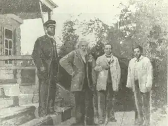 Н.А.Тунёв, Д.И. Менделеев, крайний справа Гилёв Ф.В. на крыльце дома управляющего Н.А. Тунёва, 11 июля 1899 года