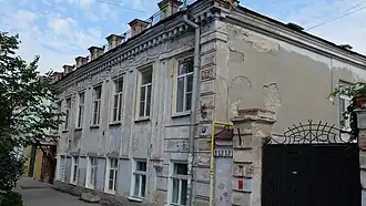 Полутораэтажный дом с семью окнами по горизонтали построен в стиле раннего классицизма. Вход в здание выполнен в его левой части. Въезд во двор здания через металлические ворота с декоративной решеткой и колоннами — справа.