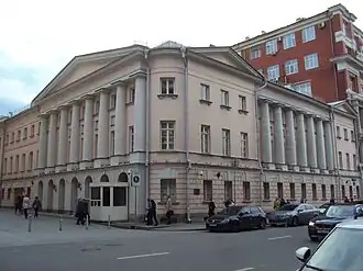 Здание построено в стиле классицизма. Южный протяжённый фасад, по Копьёвскому переулку, состоял из трёх трёхэтажных объёмов, соединённых двухэтажными (позднее двухэтажные части надстроены). Крайние объёмы выделены восьмиколонными тосканскими портиками. На фасаде, выходящем на Петровку, аналогичные колонны размещены по центру, между двумя ризалитами[2].