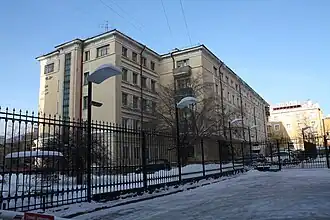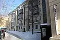 Кессонирование фасадов — главная архитектурная особенность здания. На стенах расположены углубляющиеся в стену и последовательно уменьшающиеся прямоугольные ниши, они обрамляют окна и образовывают широкие горизонтальные пояса, которые контрастируют с вертикальными лентами окон-витражей лестничных клеток, выступающих в виде эркеров из плоскости стен и придающих фасадам пластическую выразительность и насыщенность, что особенно заметно в солнечную погоду, когда на поверхности стен появляются глубокие тени.